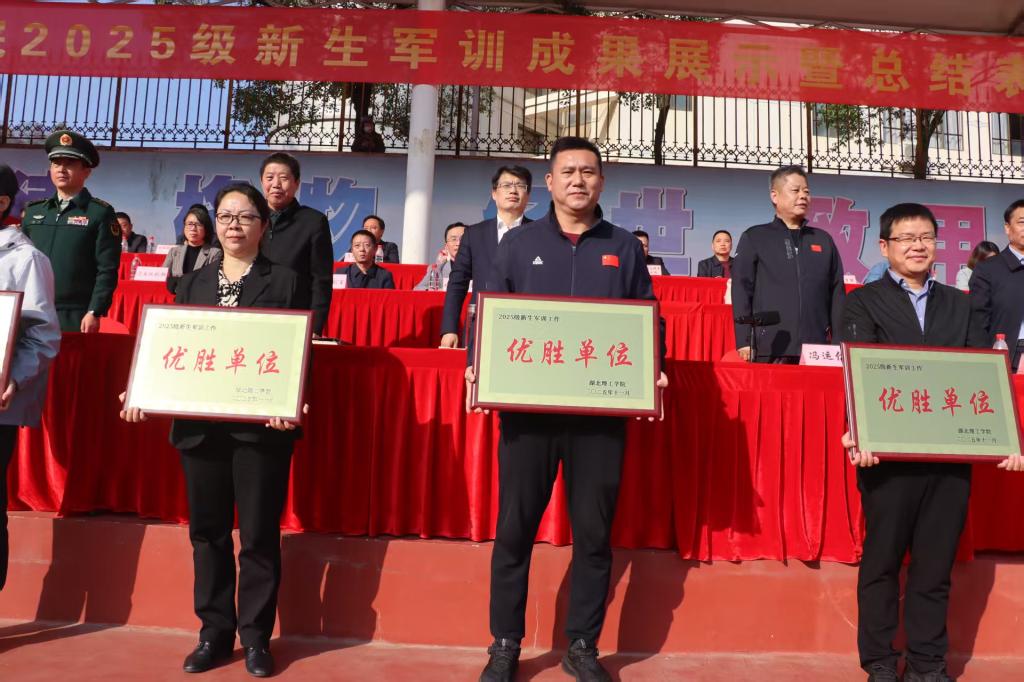 表演结束后,校长胡国珍向承训部队武警黄石支队赠送锦旗。校领导为新生军事训练优胜单位、优秀教官、优秀辅导员、优秀学员颁奖。冯运仿宣读2025级新生军训表扬文件。