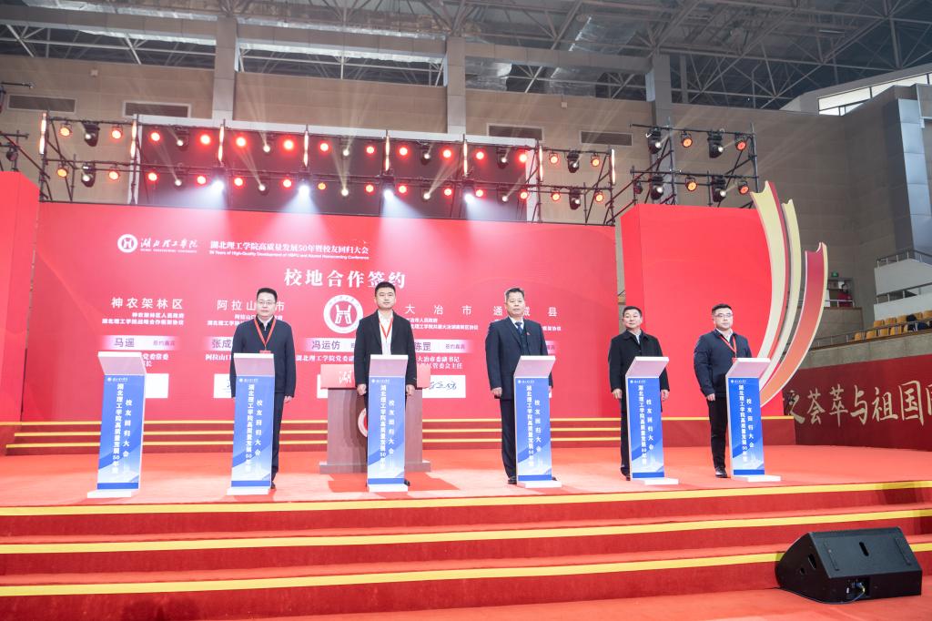 黄石市委书记郄英才发表讲话。讲话指出,湖北理工学院始终与时代共奋进、与黄石同呼吸,走出了一条扎根地方、特色发展的办学之路。50年来,学校实现从中专到专科、从专科到本科、从市属到省属、从培养本科生到培养硕士研究生的多次历史跨越,办学规模已超2.1万人,多项教育改革扎实推进。学校全面对接黄石产业发展需求,近三年校企合作超过1400项,科技成果转化落地430余项,毕业生年均留黄率达到21%,真正实现了城市与大学的双向赋能、彼此成就、共同承担。郄英才希望,湖北理工学院坚守初心、勇担使命,在服务地方发展中展现新作为,坚持社会主义办学方向,紧扣应用型办学定位,深化教育教学改革,提升科技创新和成果转化能力,深度融入和服务黄石的经济社会发展,加快建设特色鲜明的高水平应用型大学,为黄石加快建成武汉都市圈重要增长极提供人才和智力支持。他表示,市委市政府将坚定不移实施科教兴市、人才强市战略,营造更优环境,全力支持学校发展。希望广大校友心系母校、情牵黄石,期待大家发挥桥梁纽带作用,积极宣传黄石、推介黄石,带动更多的优质资源、技术和人才汇聚黄石,共享机遇、共筑梦想,市委市政府将为大家回归发展保驾护航;希望广大师生锤炼本领、奋发有为,在投身实践中绽放新风采;希望老师们潜心育人、严谨治学,担当起传播知识、启迪思想、培育新人的美好使命;希望同学们珍惜时光、增长才干,努力成长为栋梁之才。期待更多学子选择黄石、扎根黄石、建设黄石,在这片热土上点亮青春,成就梦想。