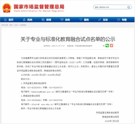 本网消息 近日,国家市场监督管理总局、教育部联合公布了首批专业与标准化教育融合试点名单,我校以鲜明的办学特色与创新的应用型人才培养体系成功入选,获批开展为期2年的公共教育培养模式试点,这标志着学校在标准化人才培养领域取得国家级新突破。