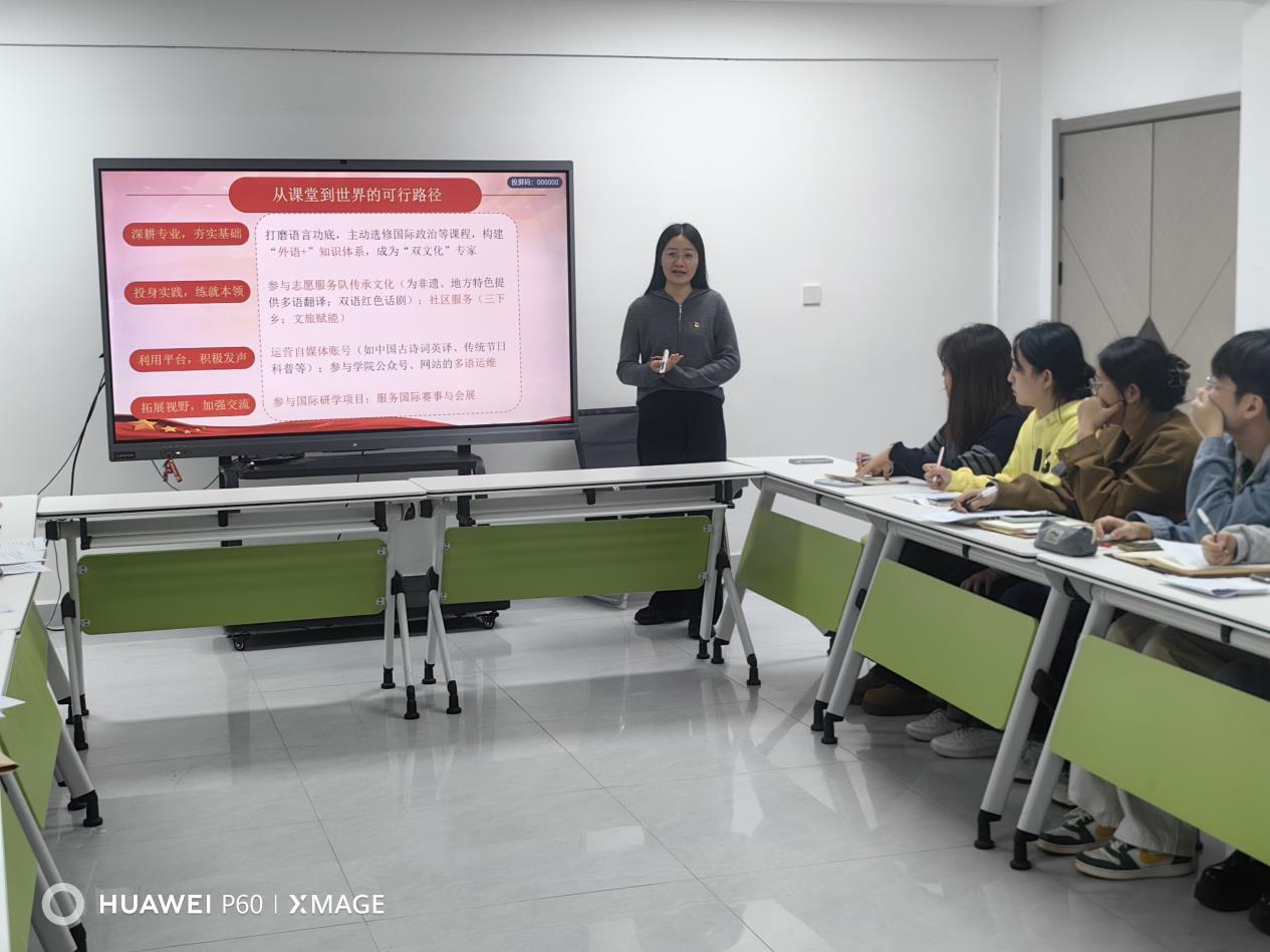 本网消息 10月20日,外国语学院在毓成公寓求实学生社区102室开展了“赓续抗战精神讲好中国故事”专题党课。英语专业学生党支部与商务英语专业学生党支部全体党员参与,活动由英语系教工党支部鲁凯莉老师主讲。此次活动旨在深入推进党史学习教育,激励广大师生党员从伟大抗战精神中汲取奋进力量,并将其转化为立德树人、传播中国声音的实际行动。