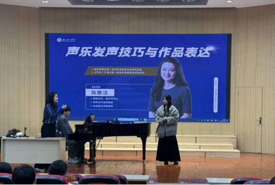本次活动是艺术学院音乐学湖北省一流本科专业建设点与《声乐Ⅰ》湖北省一流本科课程建设的系列交流活动之一,旨在搭建专业前沿对话平台,助力师生提升声乐演唱与教学水平。讲座现场氛围热烈,实践互动环节成为一大亮点。艺术学院1位教师与4名学生先后登台,分别演绎了德语、意大利语声乐作品及中国艺术歌曲。针对每一位演唱者的表现,陈雅洁博士从美声唱法的发声基础切入,展开细致入微的分析与针对性指导。指导效果立竿见影,每一位演唱者均在音乐性和语言“高级感”方面有了显著变化。她重点强调,歌唱中的声音共鸣需与语言发音深度融合,唯有如此,才能实现“腔体稳定、气息稳固、位置保持、音色统一的”理想歌唱状态,为在场师生厘清了声乐技巧与语言表达结合的核心逻辑。作为中央音乐学院的专业教师,陈雅洁博士深耕歌剧艺术与声乐教育领域,此次讲学不仅为我校艺术学院的声乐教育教学注入了新活力,更让我院师生近距离接触行业前沿理念,为今后的专业学习与教学实践拓宽了思路。
