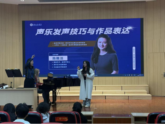本网消息 11月3日上午,艺术学院迎来一场高规格声乐艺术交流活动——中央音乐学院青年女中音歌唱家、歌剧艺术与教育学双博士陈雅洁老师受邀到访,以“声乐发声技巧与作品表达”为题,为学院师生带来了一场兼具理论深度与实践指导意义的专题讲座。艺术学院副院长雷晓伟、音乐系主任韩雪静及百余名音乐系师生一起聆听了讲学。