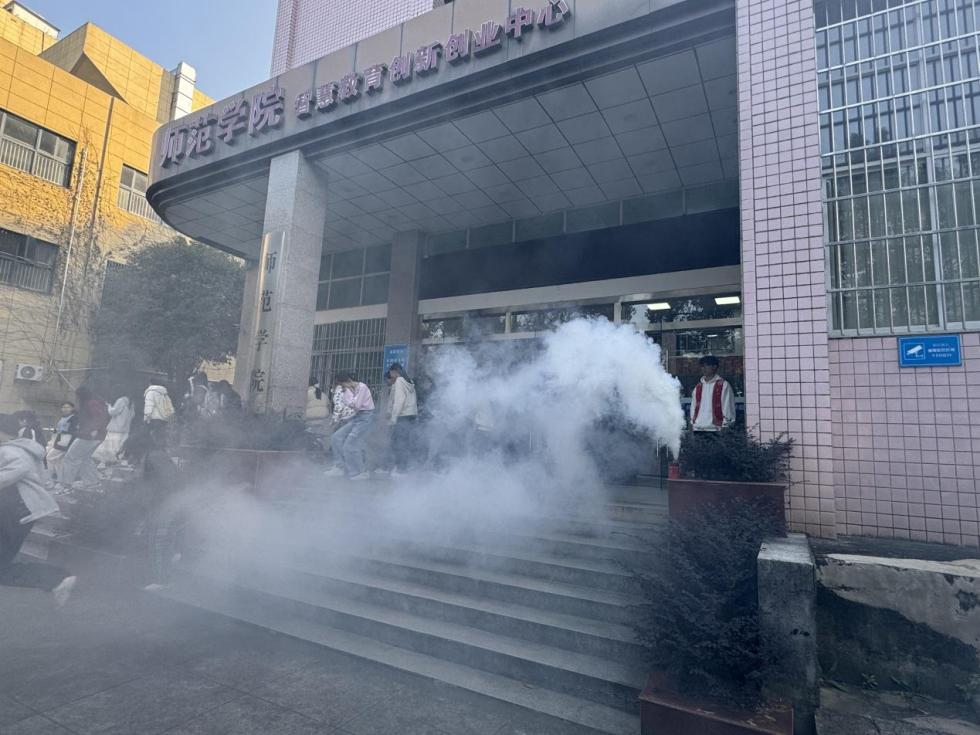 随着模拟烟雾的升起和急促的消防警报声划破长空,演练正式拉开帷幕,学院立即启动应急疏散预案。各楼层志愿者、学生干部及保卫处工作人员迅速到达指定岗位,沉着冷静地指挥师生沿着疏散路线,快速、有序地从师范学院楼内撤离。
