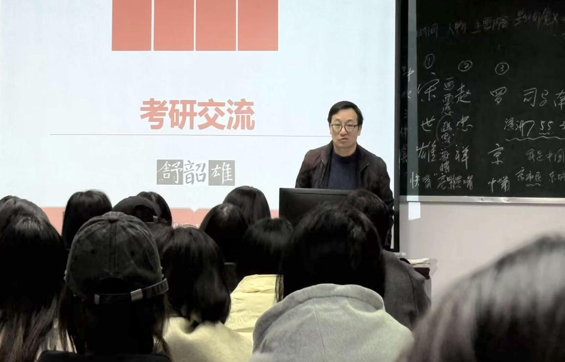 11月20日,舒韶雄教授为汉语言文学专业大二、大三学生作考研辅导讲座。讲座结合2026年考研报名人数首降但统考竞争加剧的趋势,详解考研全流程、院校专业选择技巧及国家线与复试线要求,分析了近四年学院汉语言文学专业考研数据,指出报考率、录取院校层次等问题。舒教授强调需结合地域、院校层次、招生情况科学择校,区分学硕、专硕差异。多位上岸学长学姐分享了分阶段复习计划、公共课备考资源及心态调节方法。