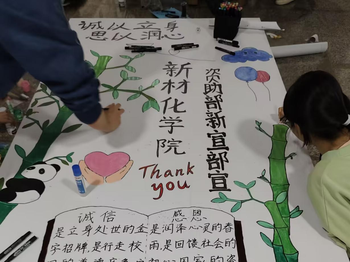 活动期间,同学们热情高涨、积极投入,以画笔为媒、以心意为墨,全身心投入到宣传展板绘制中。创作过程中,大家凝神构思、细致勾勒,一笔一画饱含专注与赤诚,一言一行彰显责任与担当;同学们分工协作、默契配合,精心排版布局,将“诚信”“感恩”的核心内涵巧妙融入色彩搭配与文字设计之中,以认真严谨的态度、饱满昂扬的热情,打造出一幅幅内容鲜明、画面精美、寓意深刻的宣传展板,充分展现了新时代青年学子积极向上、笃行向善的精神风貌。(通讯员 高春怡 黄敏楠 审核 高飞)