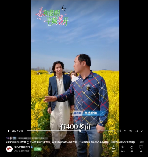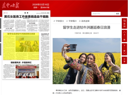 本网消息 近日,我校组织留学生开展了“读懂中国·魅力黄石”系列文化体验及社会实践活动。从西塞山河口镇漫山遍野的金色油菜花海,到阳新县金海万亩茶园里沁人心脾的茶香,留学生们以“文化使者”的独特视角,用眼睛观察、用双手触摸、用心灵感受,生动地展现出黄石在乡村振兴、文化传承与城市发展中的崭新面貌。此次活动先后获得学习强国、湖北电视台、黄石日报、东楚晚报等多家主流媒体报道,相关图文报道及视频同步发布在海外社交媒体“Discover Huangshi”外宣版块,实现海内外双线传播,引发广泛社会关注与热烈反响。